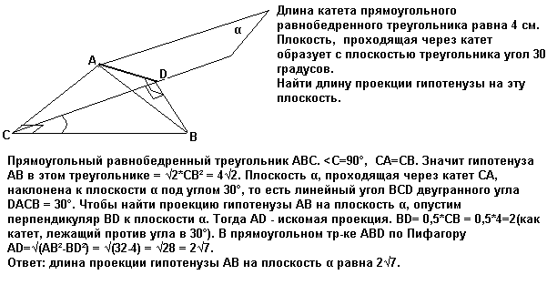 нарисуйте рисунок к данной задаче длина катета прямоугольника равнобедренного треугольника - 4 см. Плоскость альфа проходящая через этот катет образует с плоскостью треугольника угол величина которого равна 30 градусов. Найдите длину проекции гипотенузы на плоскость альфа