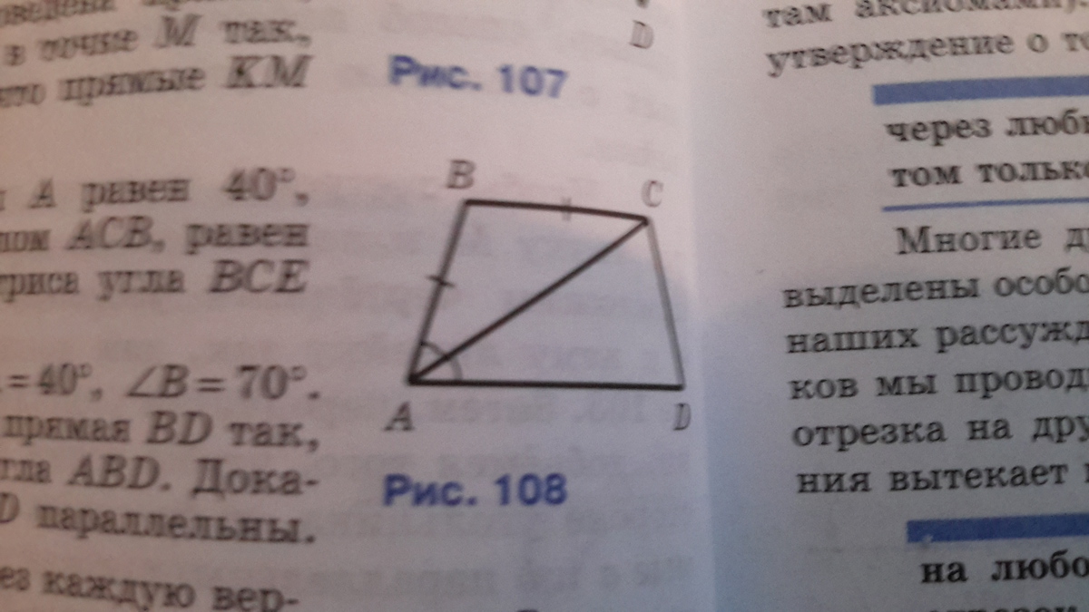 В четырехугольнике ABCD (рис 108 в учебнике) АС - биссектриса угла А, AB = BC.
