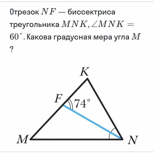 Поскольку отрезок NF - биссектриса треугольника MNF = 1 / 2 угла___, MNF = ___ градусов, Угол KFN - ____ угол треугольника MNF