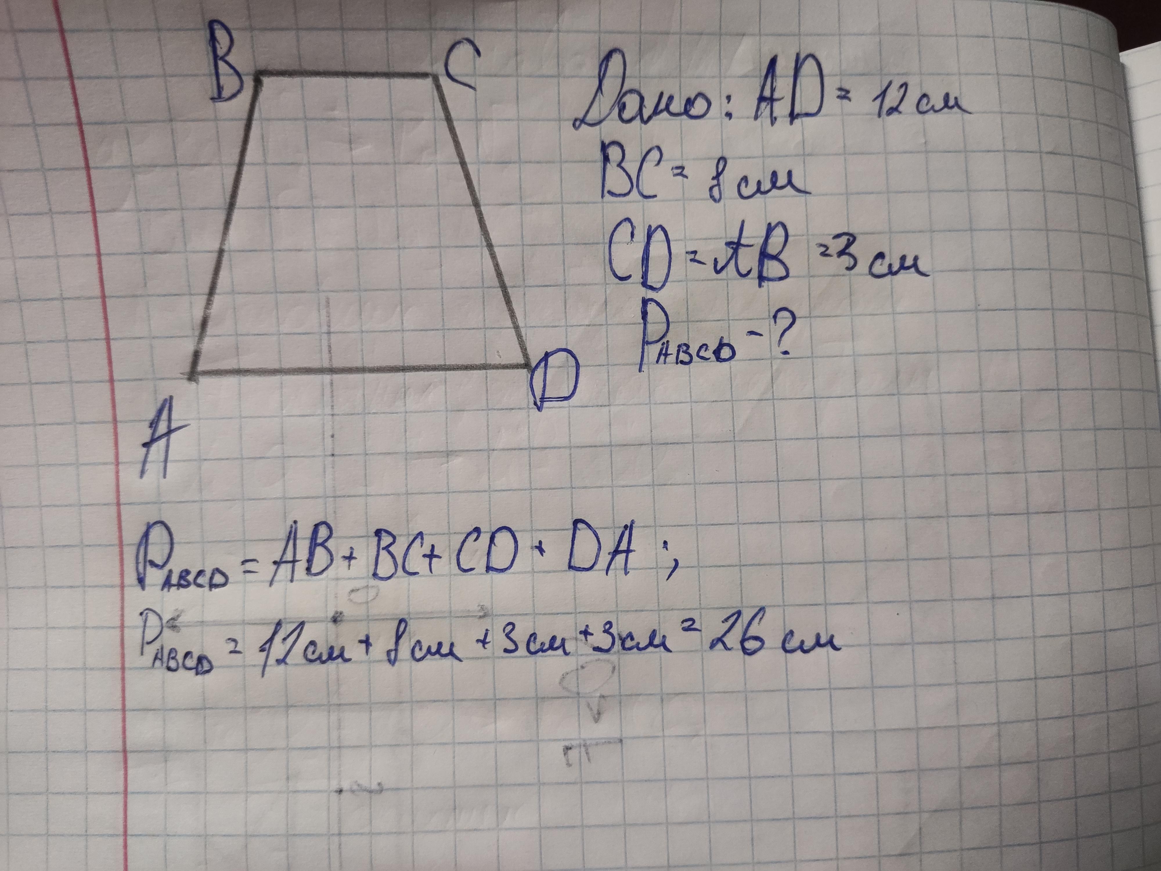 Знайдіть периметр рівнобічної трапеції , у якої основи та бічна сторона дорівнюють відповідно 12см, 8см, 3см.