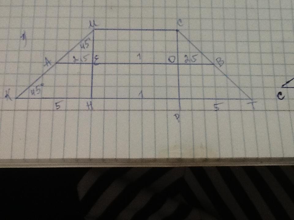 Дано : КМРТ - трапеція, КМ = СТ,   ; ∠К = ∠Т = 45° ;   ; МН - висота, МН = 5 см,   ; АВ - середня лінія, АВ = 6 см.