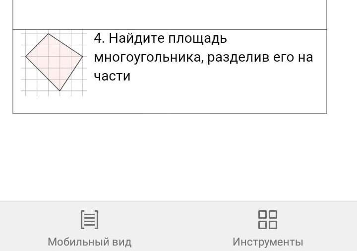 На этой странице сайта вы найдете ответы на вопрос 4. Найдите площадь многоугольника, разделив его на части?, относящийся к категории Геометрия. Сложность вопроса соответствует базовым знаниям учеников 5 - 9 классов. Для получения дополнительной информации найдите другие вопросы, относящимися к данной тематике, с помощью поисковой системы. Или сформулируйте новый вопрос: нажмите кнопку вверху страницы, и задайте нужный запрос с помощью ключевых слов, отвечающих вашим критериям. Общайтесь с посетителями страницы, обсуждайте тему. Возможно, их ответы помогут найти нужную информацию.