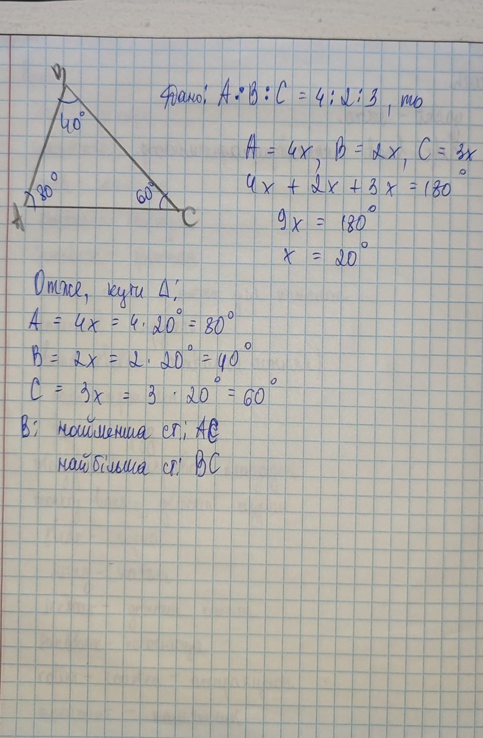 Знайдіть кути трикутника АВС, якщо А : В : С = 4 : 2 : 3.