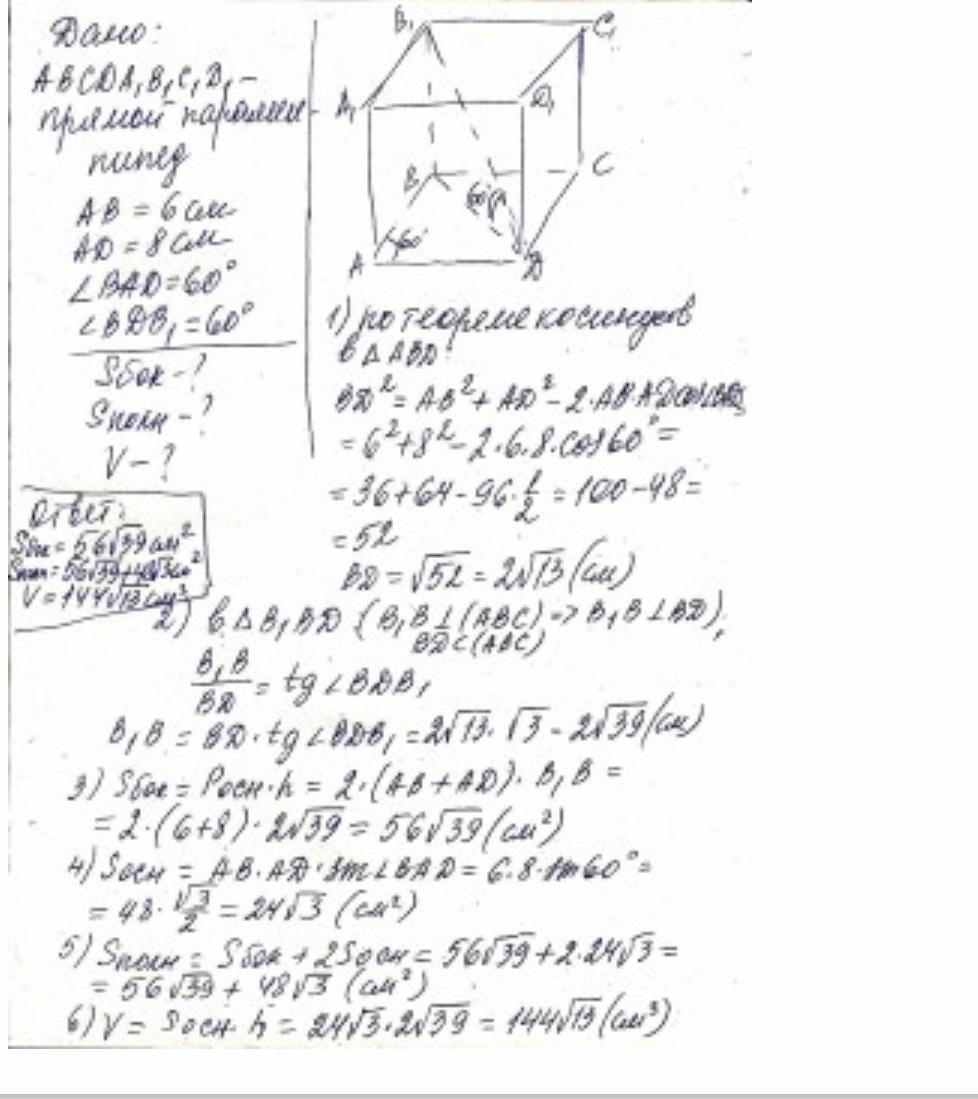 2. В прямоугольном параллелепипеде стороны основания равны 6 см и 8 см, а диагональ параллелепипеда наклонена к плоскости основания под углом 60 градусов.