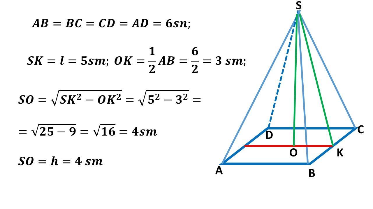ПОМОГИТЕ СРОЧНО В правильной четырехугольной пирамиде сторона основания 6см а апофема 5см.